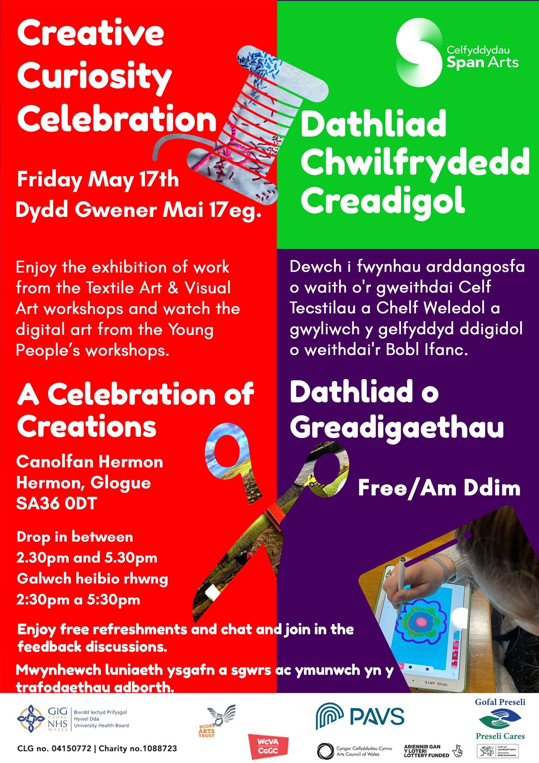 The Creative Curiosity project led by SPAN Arts was funded by the Arts Council of Wales, Arts Health, and Wellbeing fund. The project delivered in partnership with Hwyl Dda Health Board connected with the aims of Preseli Cares, a wider ‘Community-led care’ project delivered by Cwmpas, which worked to explore how communities can develop solutions to their own care and support needs.