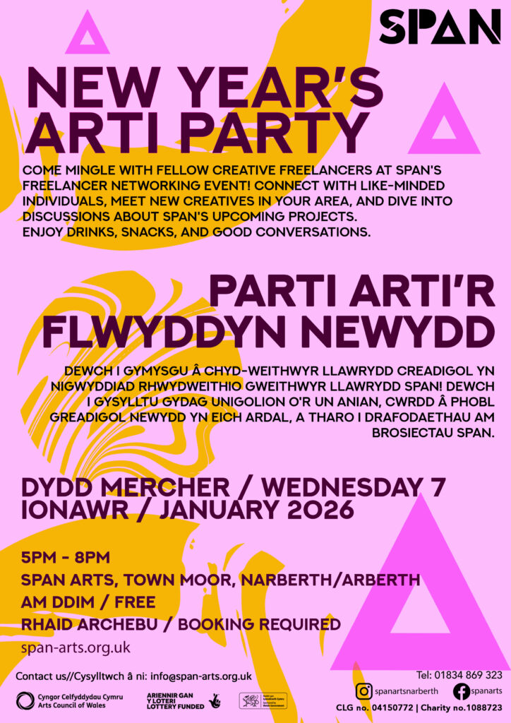 Ymunwch â ni ar 7 Ionawr am noson rydd ac groesawgar yn SPAN Arts, wrth i ni gyfuno artistiaid lleol, creaduriaid, a rhyddfreinion am gyfle i gysylltu, rhannu syniadau, a sbarduno cydweithrediadau’r dyfodol.